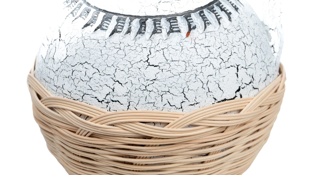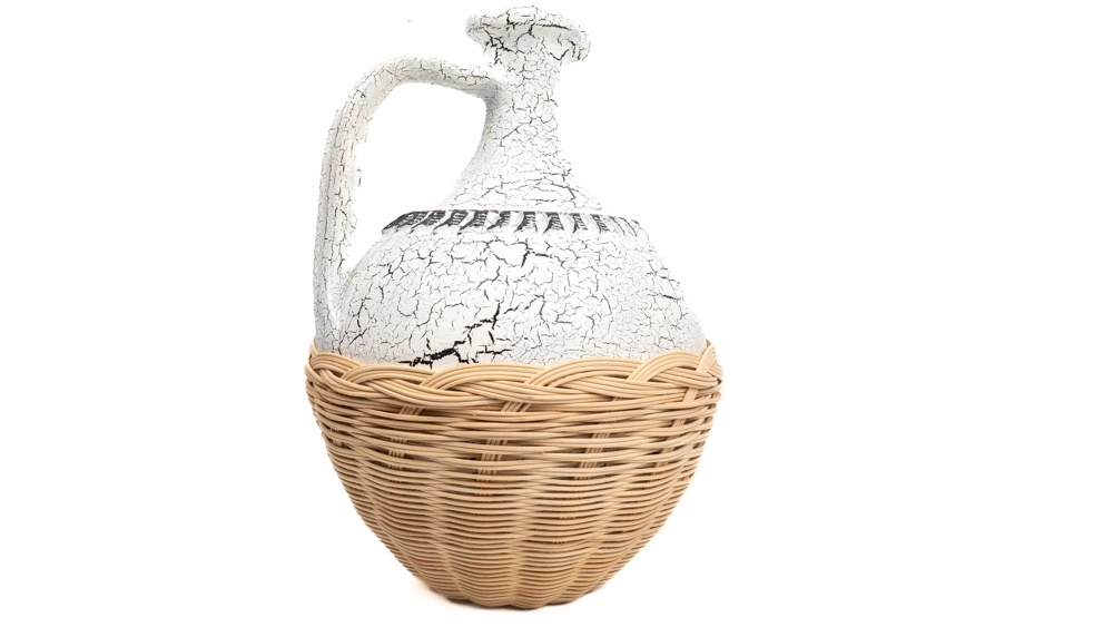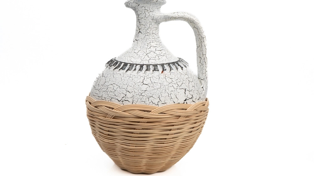 ÇATLATMA TEKNİĞİ İLE BOYANMIŞ TESTİ ÜZERİNE ÖRÜLMÜŞ DOĞAL RATTANLA OLUŞTURULMUŞ TASARIM OBJE