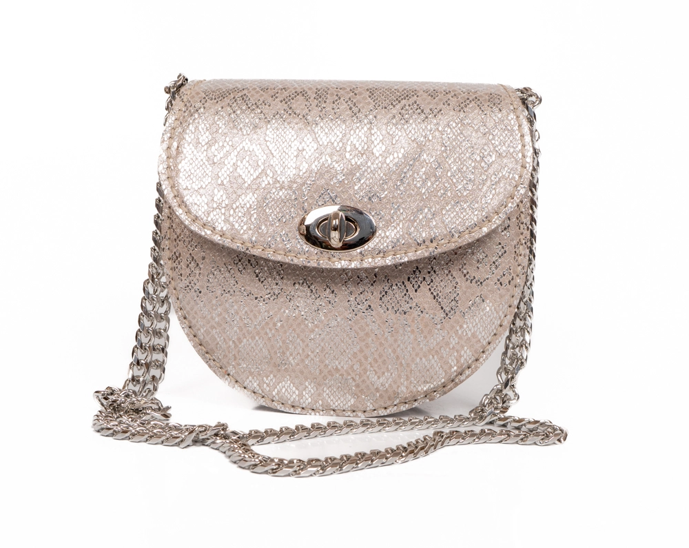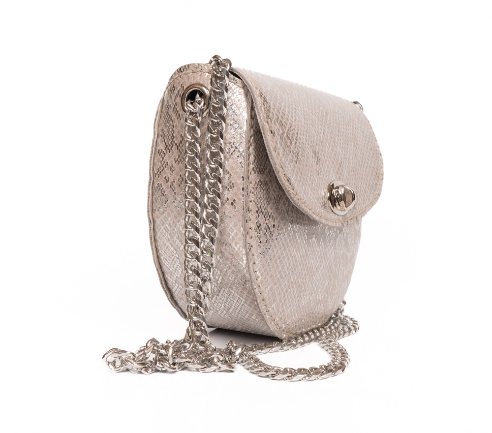 - FLOTER BASKILI ÖNÜ GÜMÜŞ RENK METAL TOKALI, ASKILARI GÜMÜŞ RENK ZİNCİR OLAN OMUZ ÇANTASI