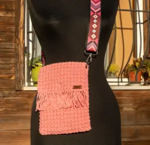 Pembe Makrome Tığ Örgü Boncuk Model Çapraz Çanta