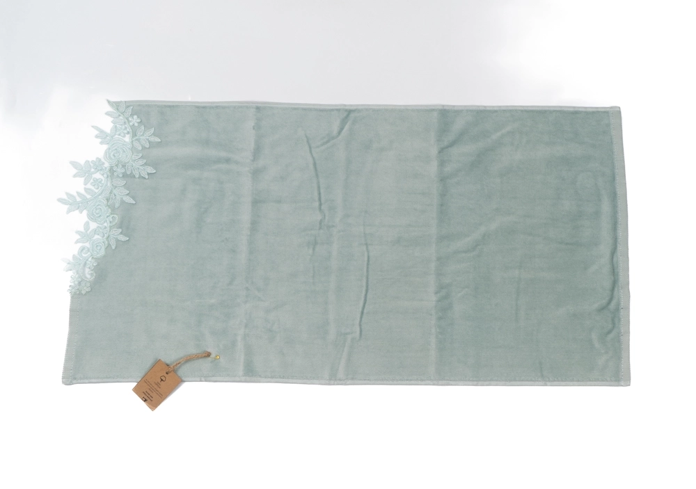 Kadife havlu kenarına yeşil aplik sarma teknigiyle geçirilmiştir